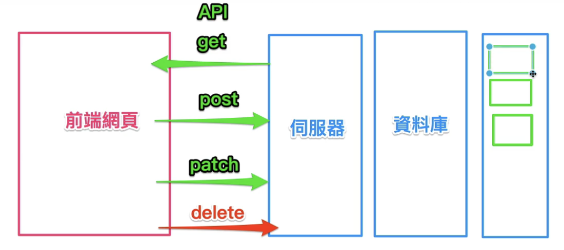 我們前端網頁要取得後台資料庫,前端網頁是無法透過任合方式直接去操作資料庫的內容,因此中間一定都會有後端的伺服器,那前端網頁跟伺服器怎麼溝通呢?用 API 的方法去溝通,API 本身是一個網址,可對 API 進行各種操作,例如我要取得資料(get)、新增資料(posr)、更新資料(patch)、刪除資料(delete) ...等等